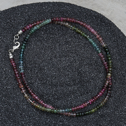 Introduced in 925 sterling silver, this timeless necklace features 3mm smooth rondelle beads in pink, blue, and green tourmaline, measuring 18" for easy styling.